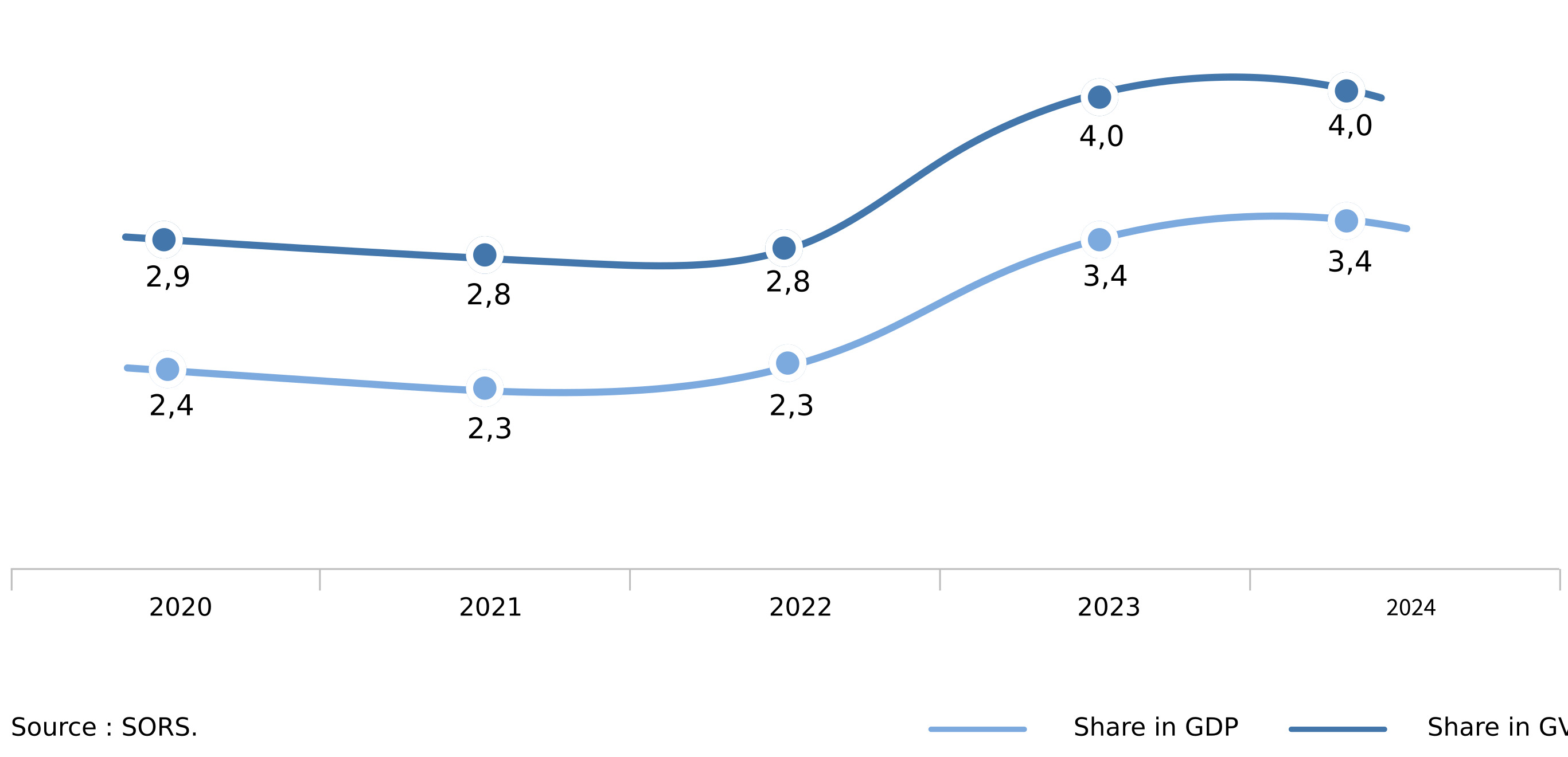 The total gross value added (GVA) generated by Professional, scientific and technical activities was nearly 2.8 billion EUR in 2024, which is the 4.0% of total GVA of the country and 3.4% of Serbia’s GDP. Observed by activities, around 1.0 billion EUR created by activities of head offices; management consultancy activities (36.8%) and 845.5 million EUR by legal and accounting activities (29.8%). The other two activities have a lower contribution. From 2020 to 2024, GVA share of professional, scientific and technical activities in total GVA and GDP of the Republic of Serbia showed a slightly increasing trend.