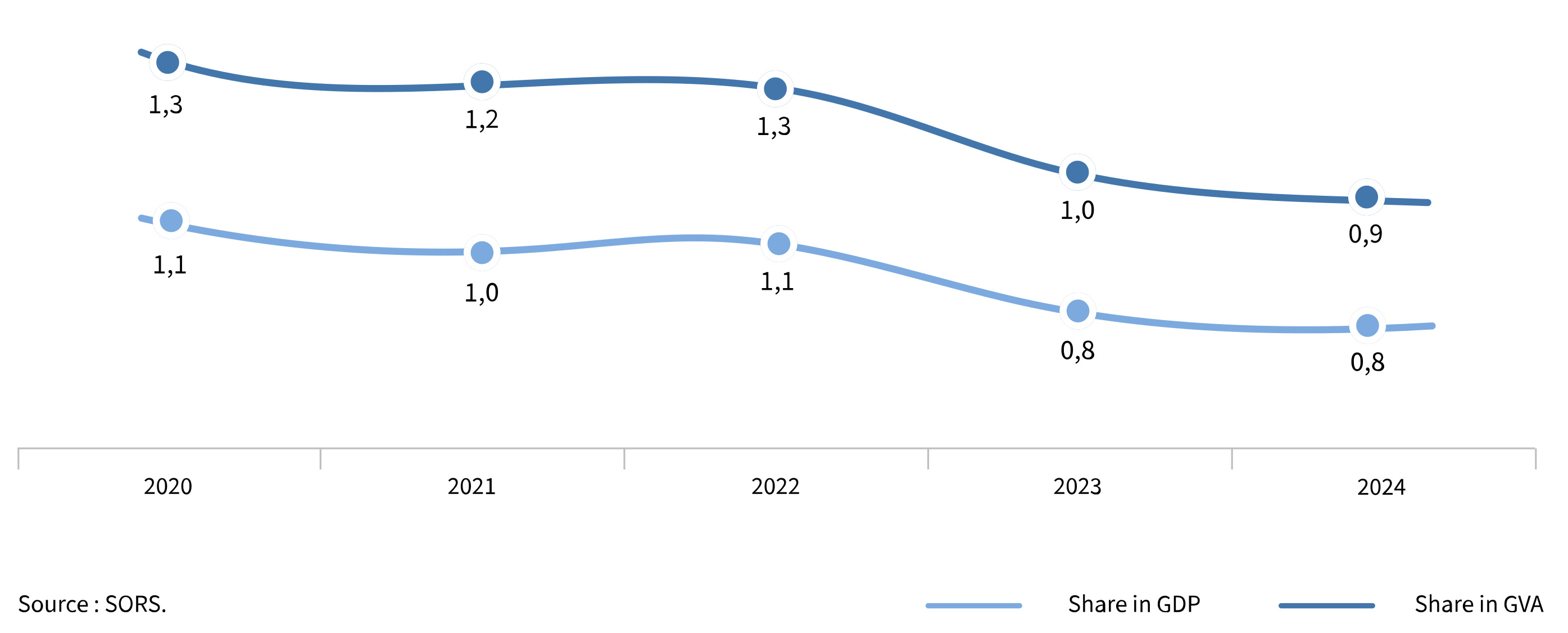 The total gross value added (GVA) generated by Public utility industry was around 611.0 million EUR in 2023, which is the 1.0% of total GVA of the country and 0.8% of Serbia’s GDP. Observed by activities, nearly 377.0 million EUR created by waste collection, treatment and disposal activities; materials recovery (61.6%) and 212.0 million EUR by water collection, treatment and supply (34.7%). The other two activities have a negligible contribution. From 2017 to 2023, GVA share of public utility industry in total GVA and GDP of the Republic of Serbia shows stable trend.