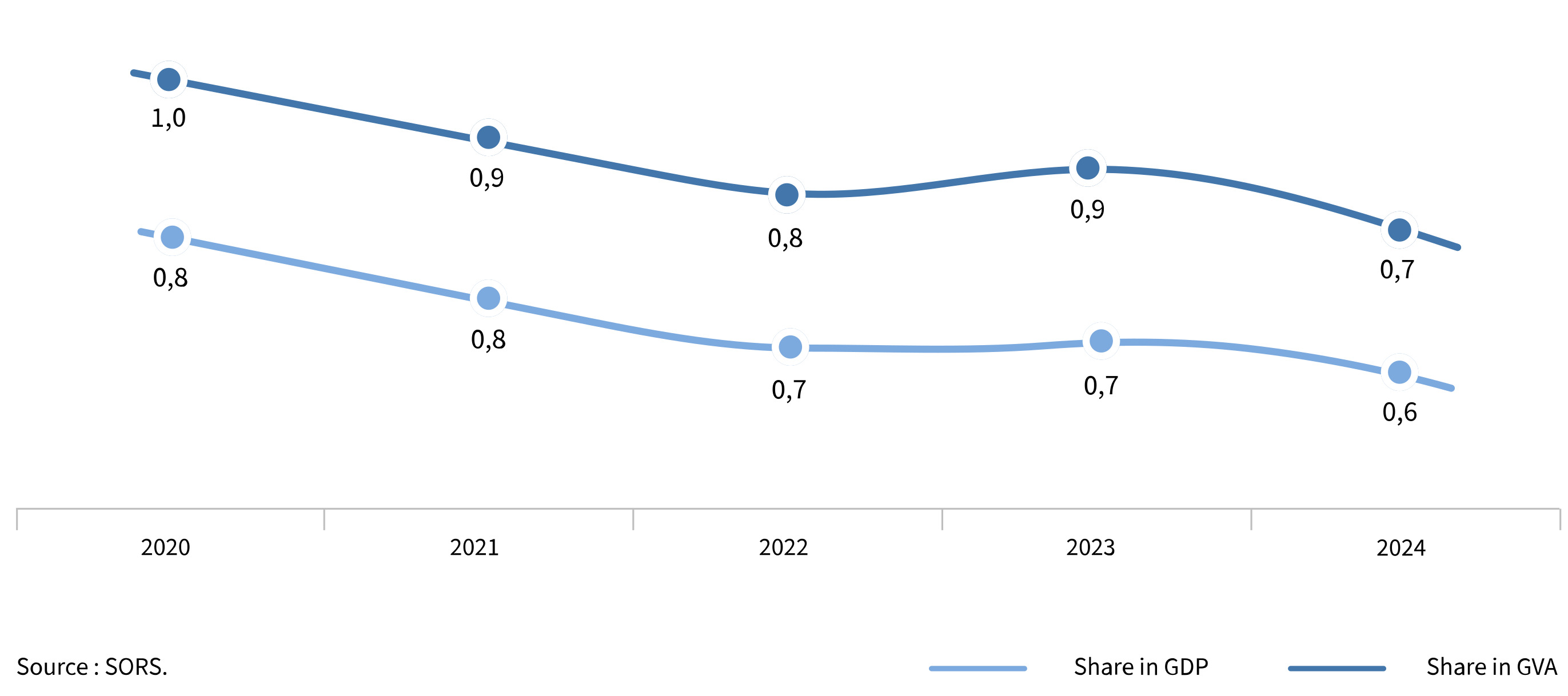 The total gross value added (GVA) generated by textile industry was 515.0 million EUR in 2024, which is the 0.7% of total GVA of the country and 0.6% of Serbia’s GDP. Observed by activities, 303.0 million EUR created by manufacture of wearing apparel (58.8%) and 109.1 million EUR by manufacture of textiles (21.2%). From 2020 to 2024, GVA share of textile industry in total GVA and GDP of the Republic of Serbia shows downward trend.