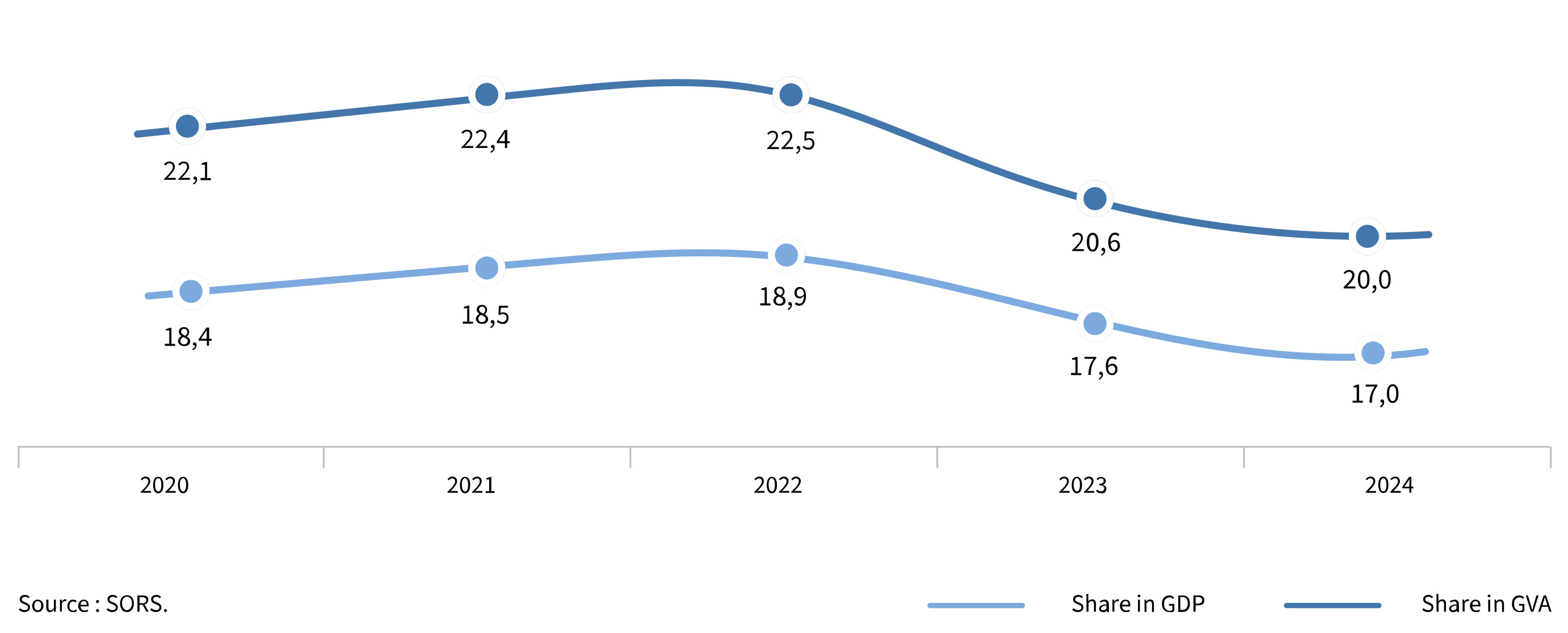 The total gross value added (GVA) generated by Trade sector was around 14.2 billion EUR in 2024, which is the 20.0% of total GVA of the country and 17.0% of Serbia’s GDP. Observed by activities, 5.8 billion EUR created by real estate activities (41.0%), 3.8 billion EUR by wholesale trade, except of motor vehicles and motorcycles (29.0%) and nearly 4.0 billion EUR by retail trade, except of motor vehicles and motorcycles (28.2%). From 2020 to 2024, GVA share of trade sector in total GVA and GDP of the Republic of Serbia shows slightly decreasing trend.