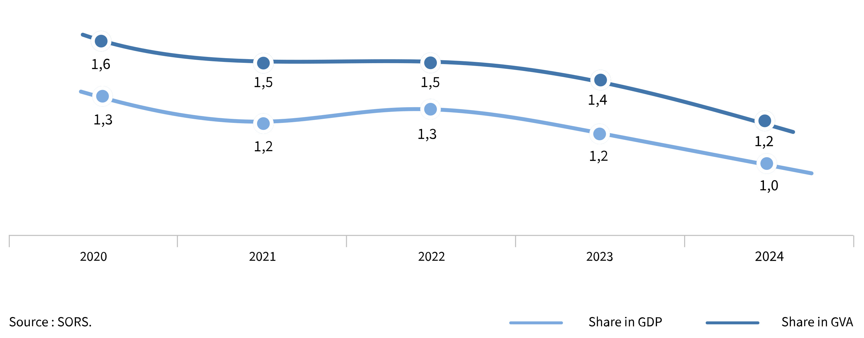 The total gross value added (GVA) generated by Forestry, wood processing, furniture and paper industries was around 825.5 million EUR in 2024, which is the 1.2% of total GVA of the country and 1.0% of Serbia’s GDP. Observed by activities, nearly 279.5 million EUR created by manufacture of paper products (33.9%) and 225.6 million EUR by manufacture of furniture (27.3%). The other two activities have a similar contribution, by around 20%. From 2020 to 2024, GVA share of forestry, wood processing, furniture and paper industries in total GVA and GDP of the Republic of Serbia shows slightly decreasing trend.