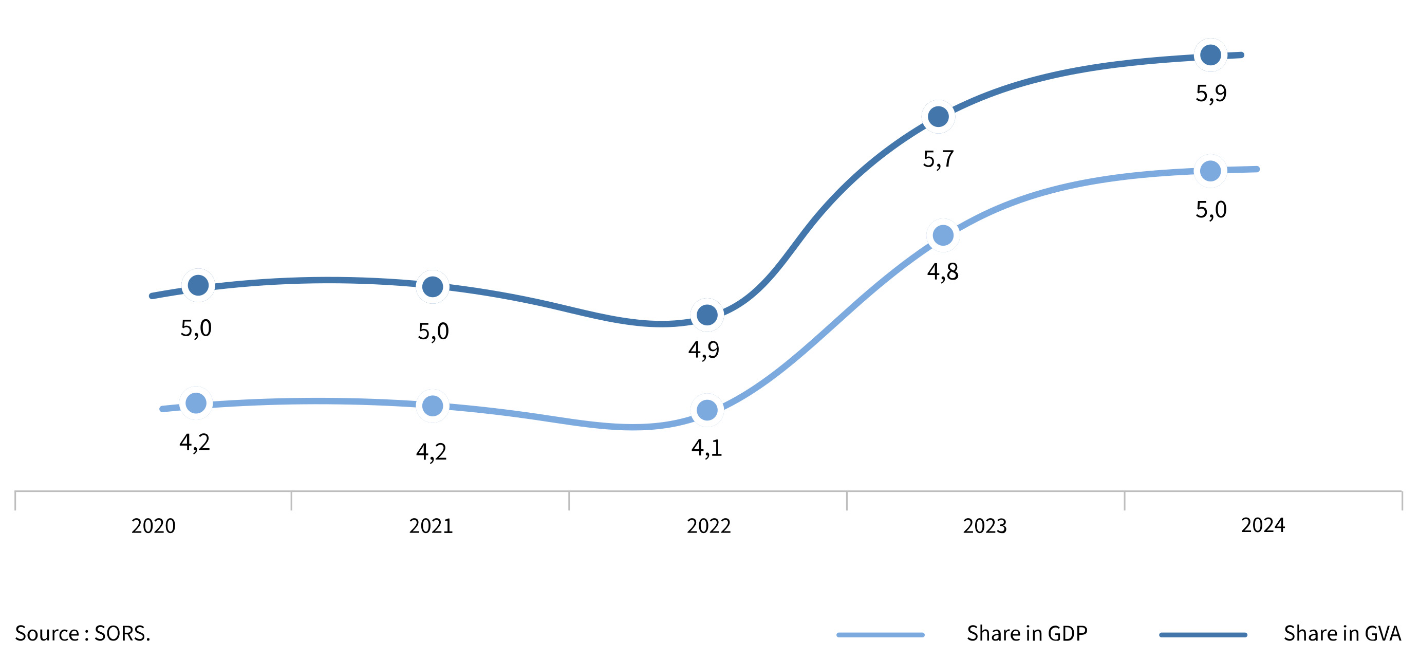 The total gross value added (GVA) generated by Metalworking and power industry was around 4.1 billion EUR in 2024, which is the 5.9% of total GVA of the country and 5.0% of Serbia’s GDP. Observed by activities, nearly 1.3 billion EUR was created by manufacture of motor vehicles, trailers and semi-trailers (30.2%) while manufacture of fabricated metal products, except machinery and equipment created 936.4 million EUR (22.6%). From 2020 to 2024, GVA share of metalworking and power industry in total GVA and GDP of the Republic of Serbia shows increasing trend.