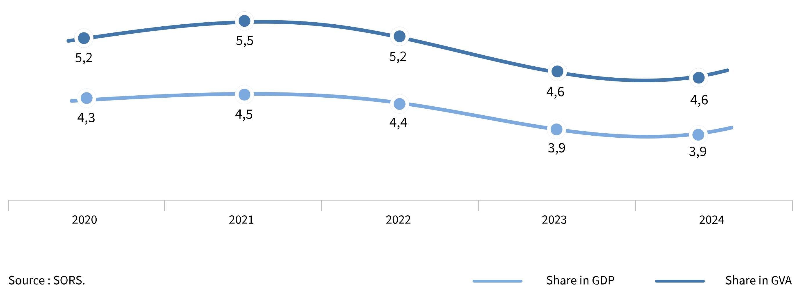 The total gross value added (GVA) generated by Pharmaceutical and medical economy was around 3.3 billion EUR in 2024, which is the 4.6% of total GVA of the country and 3.9% of Serbia’s GDP. Observed by activities, around 2.9 billion EUR created by human health activities (90.0%). The other activities have a negligible contribution. From 2020 to 2024, GVA share of pharmaceutical and medical economy in total GVA and GDP of the Republic of Serbia shows stable trend.
